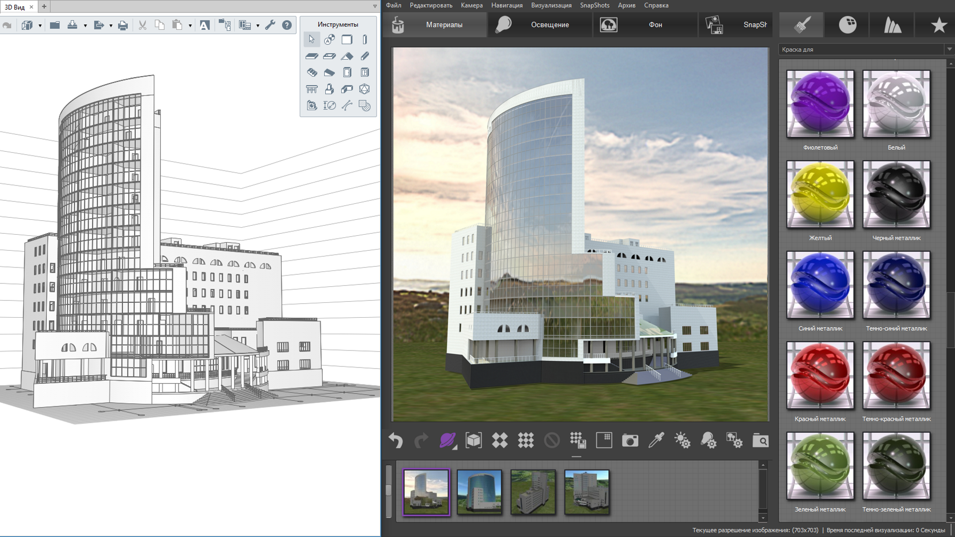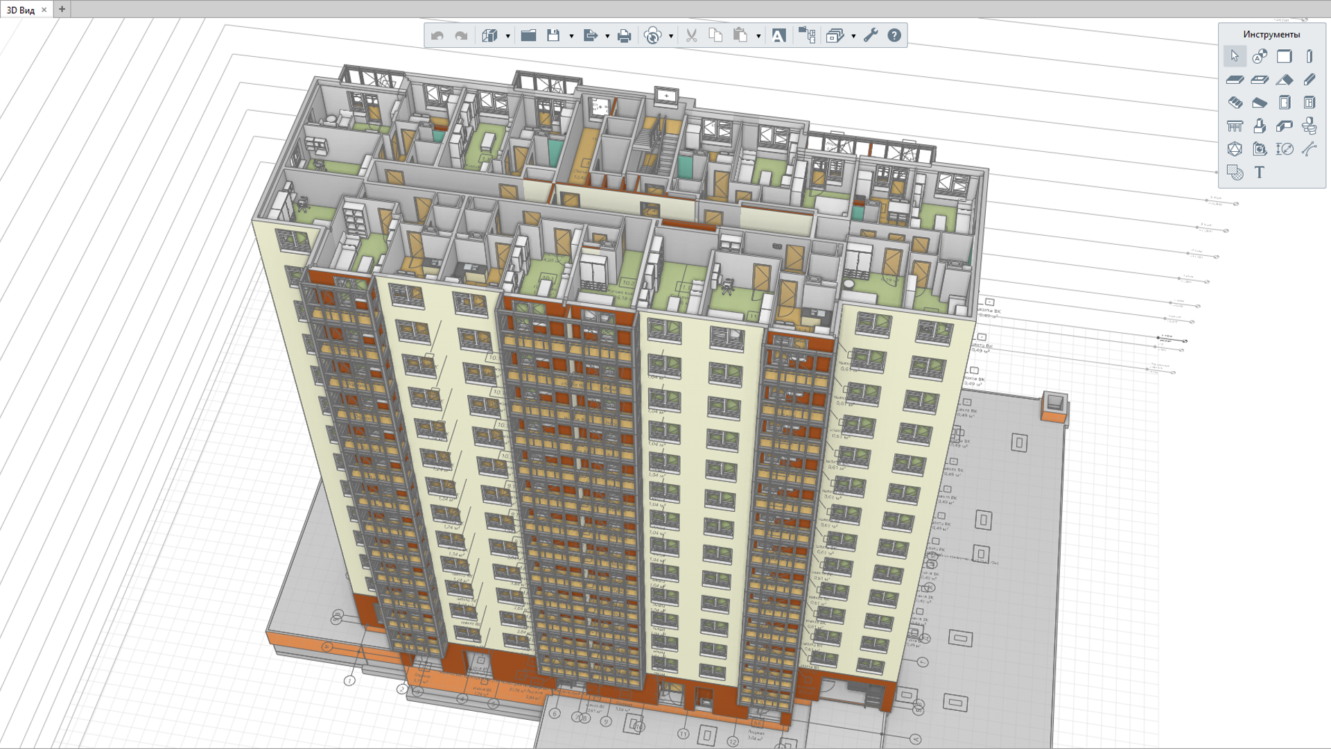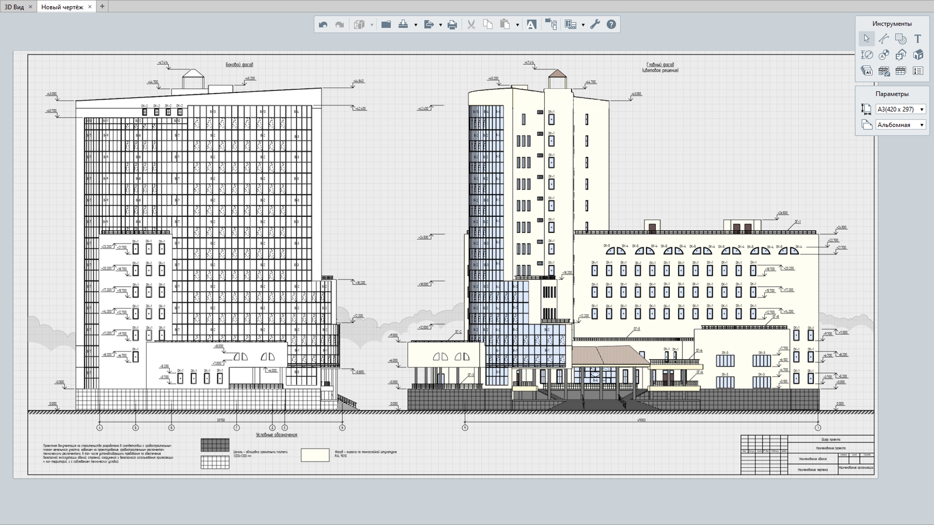 Встроенный редактор чертежей позволяет создать комплект проектной/рабочей документации. Инструменты редактора созданы для максимальной автоматизации получения чертежей. Основные виды здания (планы, фасады, разрезы) – создаются автоматически по 3D-модели.