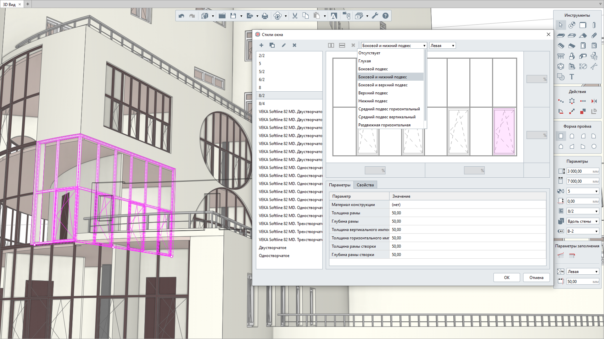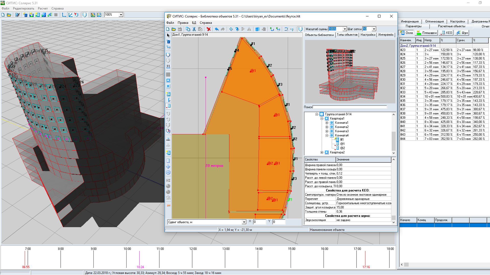 Эти данные вместе с 3D-моделью можно передать в сторонние расчетные приложения (например, СИТИС: Солярис) и выполнить в них теплотехнический расчет наружных ограждающих конструкций или расчет естественной освещенности КЕО.