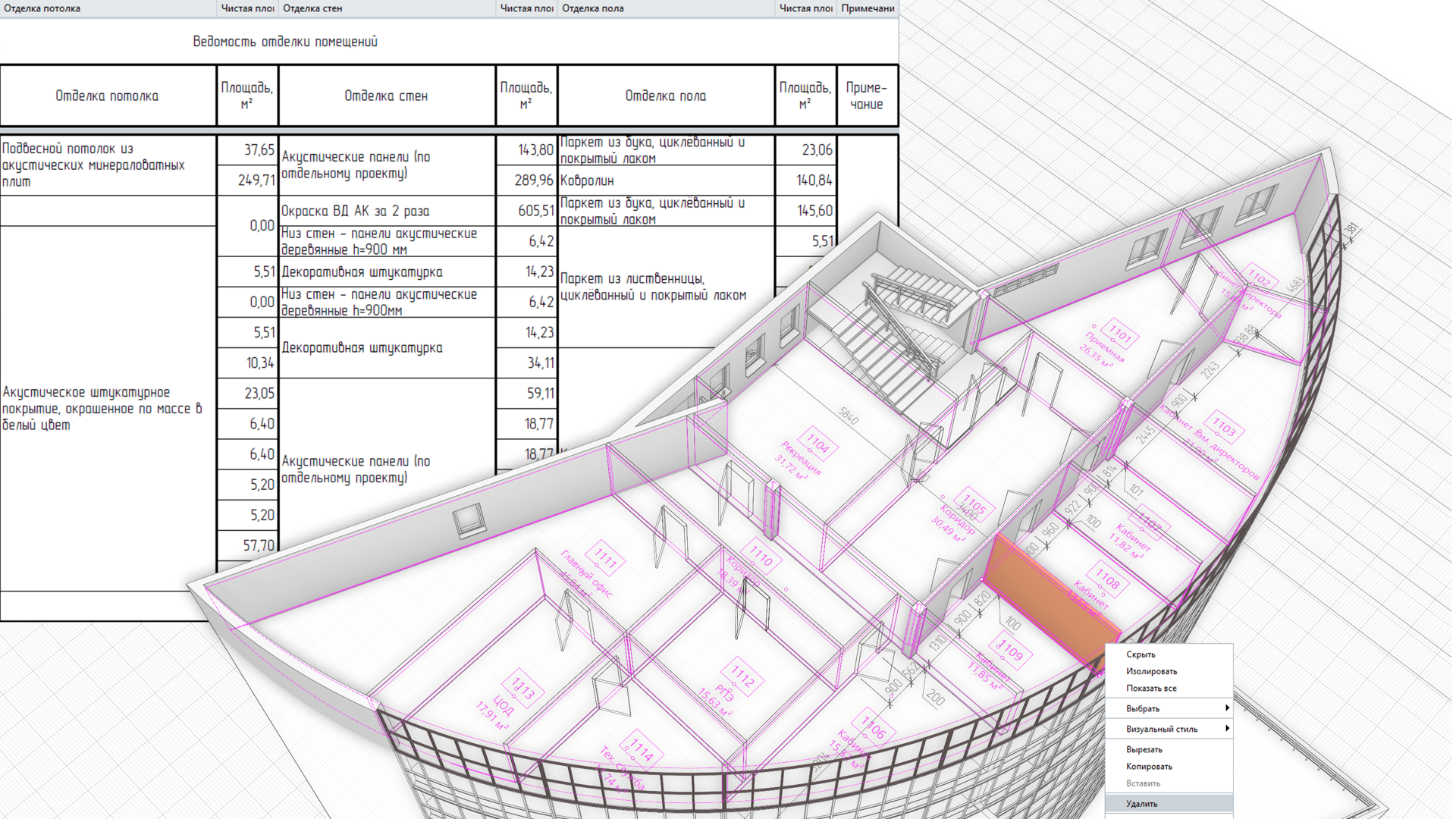 Помещения всегда будут ассоциативно связаны с окружающими их конструкциями. При изменении габаритов помещений в плане, автоматически пересчитаются площади полов, стен и потолка.