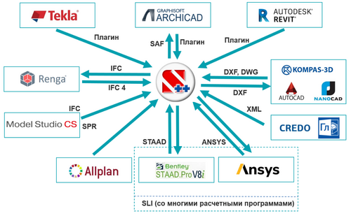 - плагины для программ Revit, ArchiCAD, Tekla позволяют работать с геометрической или аналитической моделями (с ArchiCAD через формат SAF);